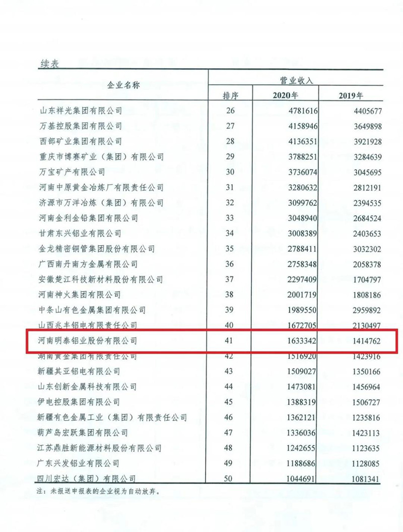 8月3日,中國有色金屬工業(yè)協(xié)會召開新聞發(fā)布會,發(fā)布2020年有色金屬工業(yè)企業(yè)營業(yè)收入50強名單。明泰鋁業(yè)以163.3億元的營業(yè)收入,榮登“2020年有色金屬工業(yè)企業(yè)營業(yè)收入50強”,排名第41位。
